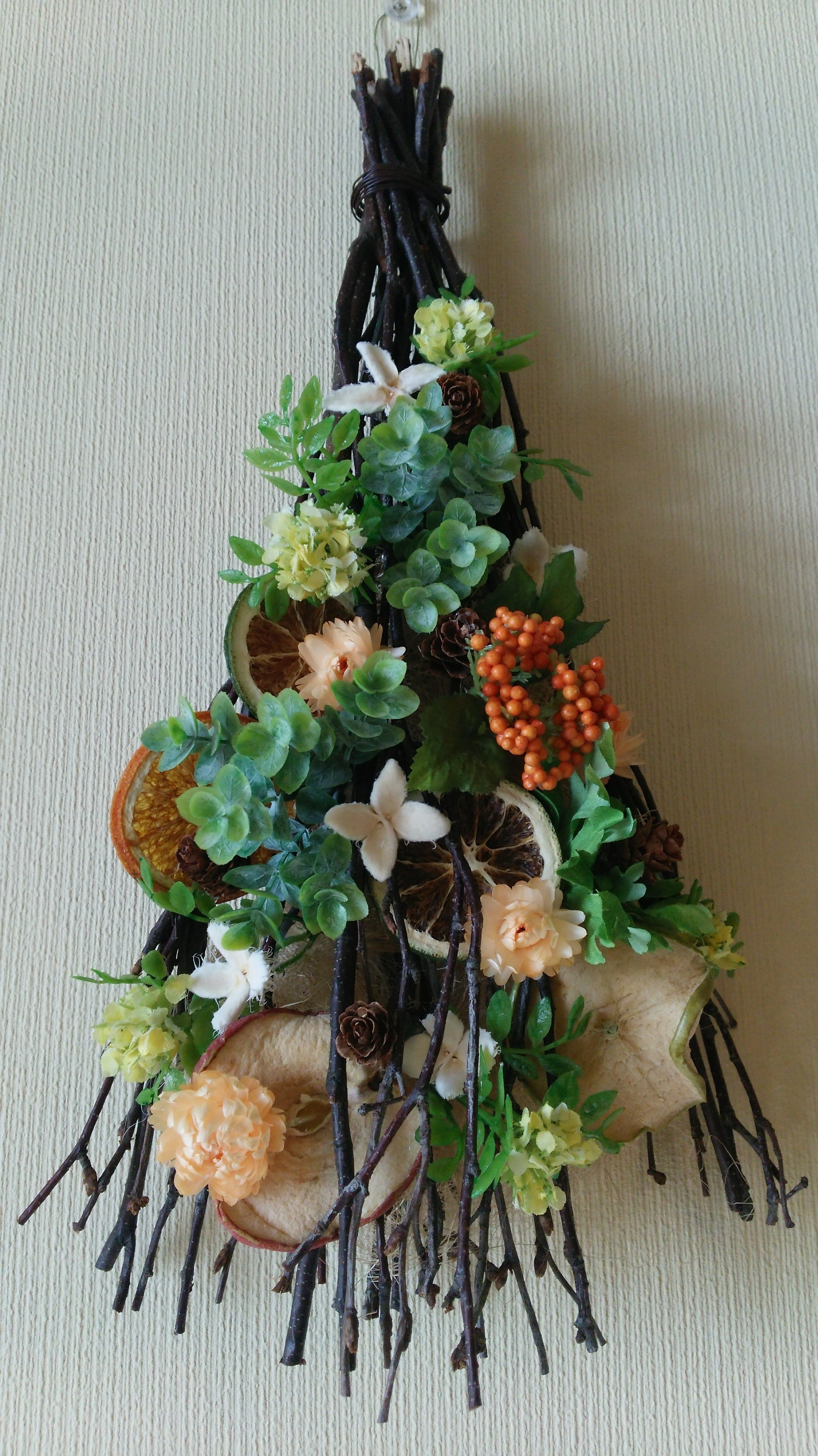 ドライフルーツとアートフラワーを使った、年中飾って楽しめるスワッグです。